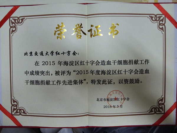 北京交通大学红十字会在2015年海淀区红十字会造血干细胞捐献工作中成绩突出,被评为“2015年度海淀区红十字会造血干细胞捐献工作先进集体”