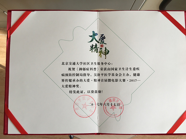 北京交通大学社区卫生服务中心《抑郁症科普》荣获国家卫生计生委疾病预防控制局指导,吴阶平医学基金会主办,健康界传媒承办的大爱·精神首届微电影大赛·2017——大爱精神奖