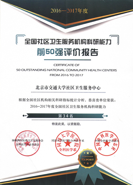 根据全国社区机构相关科研指标统计分析,荣获2016--2017年度全国社区卫生服务机构科研能力第34名