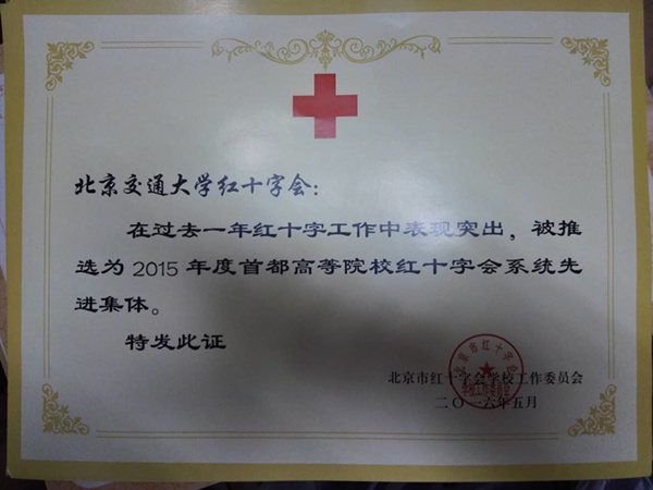 北京交通大学红十字会在过去一年红十字工作中表现突出,被推选为2015年度首都高等院校红十字会系统先进集体