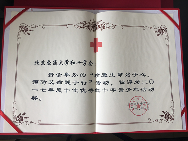 北京交通大学红十字会举办的“珍爱生命始于心,预防艾滋践于行”活动,被评为2017年度十佳优秀红十字青少年活动奖