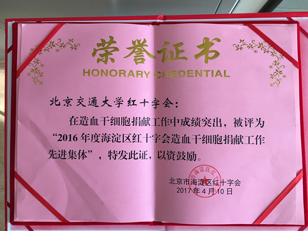 北京交通大学红十字会在造血干细胞捐献工作中成绩突出,被评为“2016年度海淀区红十字会造血干细胞捐献工作先进集体”