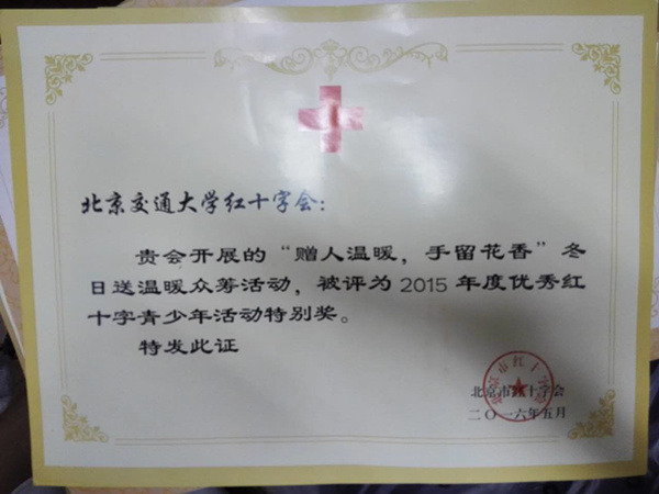 北京交通大学红十字会开展的“赠人温暖,手留花香”冬日送温暖众筹活动,被评为2015年度优秀红十字青少年活动特别奖