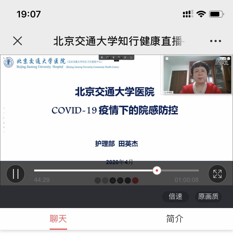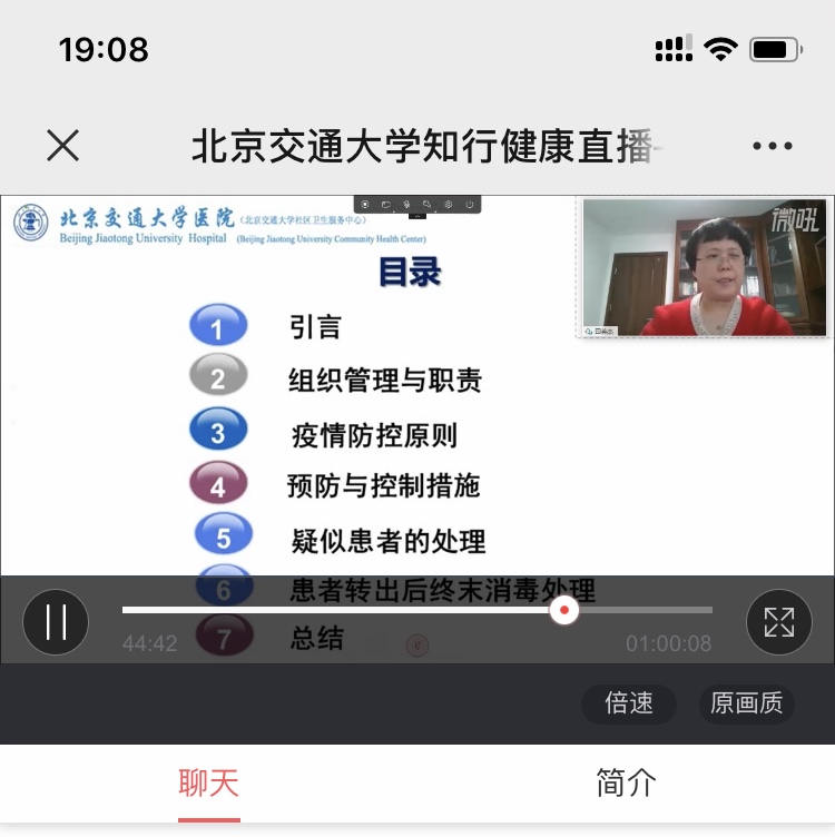 2020年4月8日中午,按照海淀区卫健委《关于加强新冠肺炎防治和院感防控知识全员培训的通知》要求,北京交通大学社区卫生服务中心依托中心思科远程视频会议平台,由护士长田英杰对中心医务人员进行了中心COVID-19 疫情院感防控应急预案的全员培训。