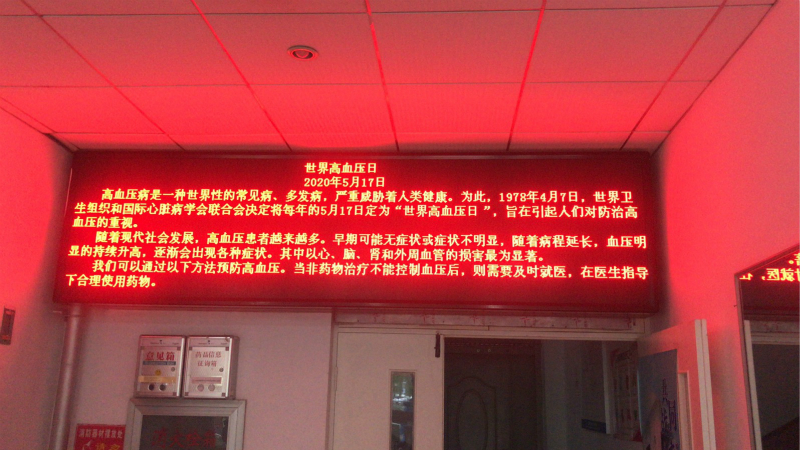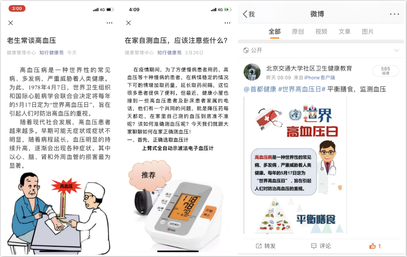 为了引起大家对高血压病的重视,我们在中心门诊楼一层放置了自制的海报。为了提高高血压相关知识的知晓率,我们撰写了高血压病的防治文章,在就诊区LED显示屏上循环播放,同时在微信“知行健康苑”平台、微博平台进行推送。